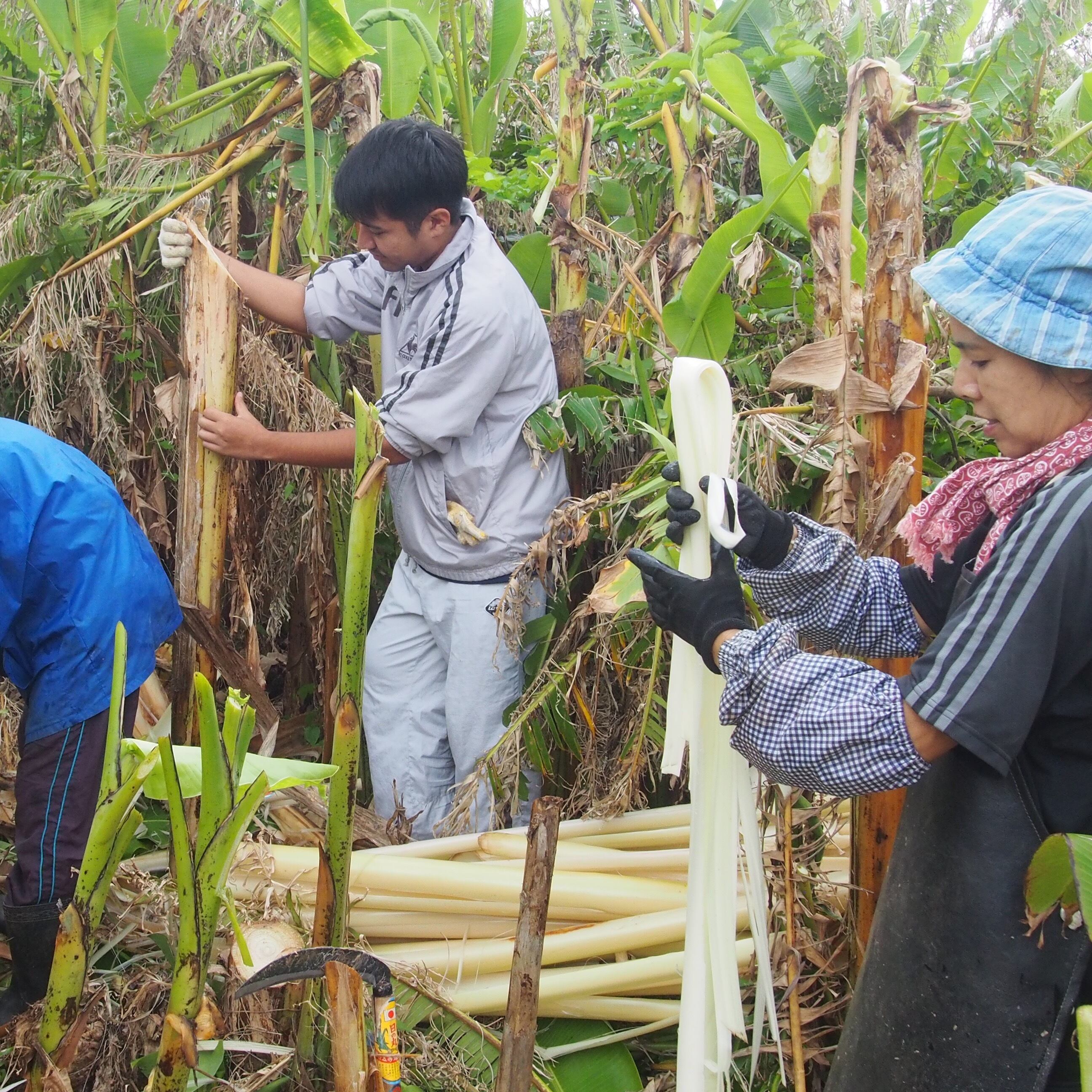 芭蕉布はかつて、奄美から沖縄にかけて着られていた伝統的な衣服でした。バナナ(実芭蕉)とよく似た糸芭蕉の茎の皮を一枚一枚剥ぎ取り、数ヶ月間の時間をかけて着物一着分の糸を作ります。その糸を織ったものが芭蕉布と呼ばれています。